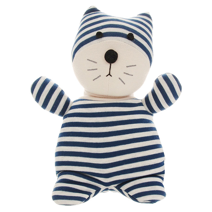 Кот Полосатик очень легкий. Сделан из полиэфирного волокна, искусственного меха и полистирола. Гипоаллергенен и безопасен для малышей.