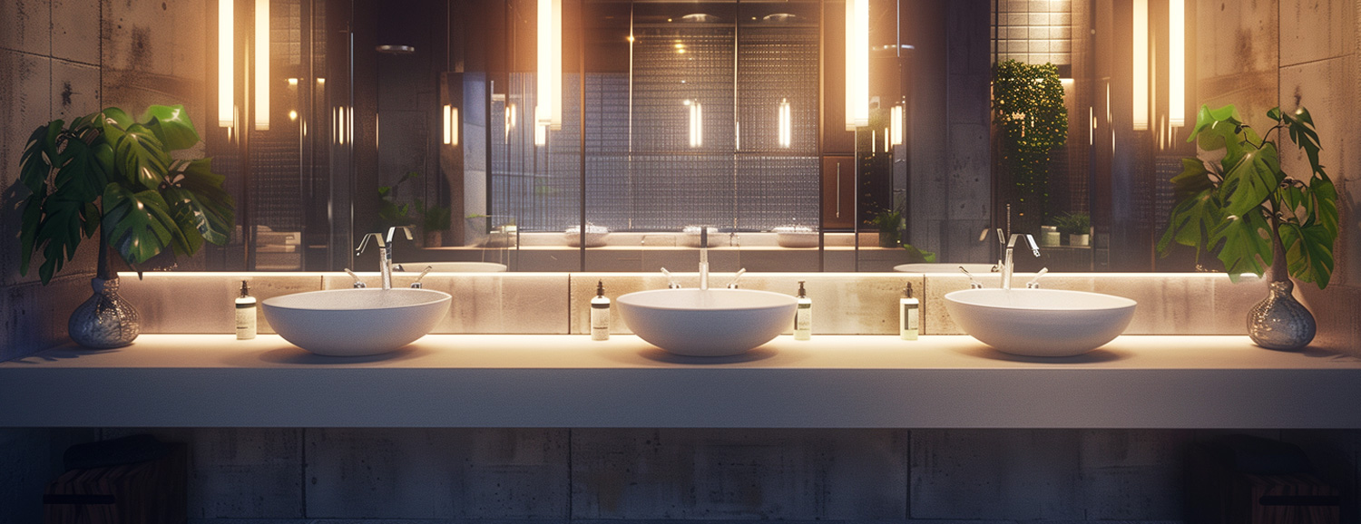 2. 4 глубокие раковины в общей комнате. Между сантехникой расстояние 40 см, чтобы расположить влажные полотенца.